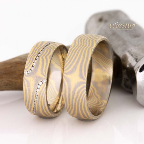 Mokume Gane Trauringe in 750 Gelbgold und 750 Weißgold mit Abura Muster und lupenreinen Diamanten.